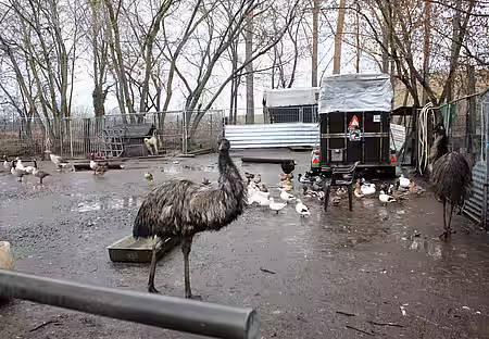 Des Weiteren wurden 2 Emus, etwa 15 Hühner, 13 Gänse und ca. 60 Enten festgestellt, die alle nicht artgerecht gehalten werden. Den Wasservögeln steht kein Badewasser zur Verfügung. Enten und Gänse benötigen dies jedoch, um ihr Gefieder zu reinigen und andere, an Wasser gebundene Verhaltensweise auszuleben. Außerdem ist der mit Tierfäkalien verunreinigte, matschige Boden unhygienisch und begünstigt die Ausbreitung von Krankheiten.