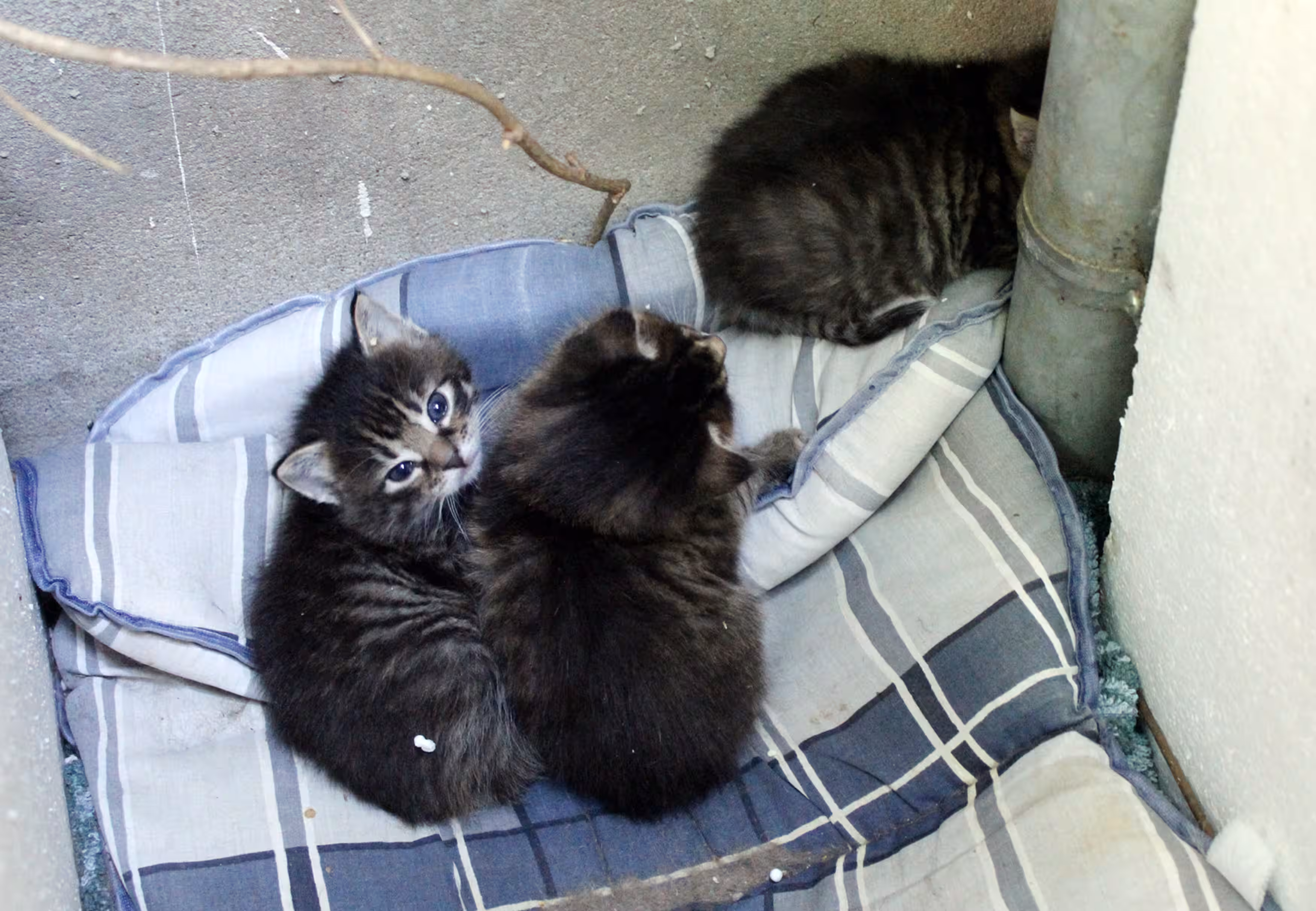 Die Mutterkatze wird hier seit längerer Zeit von Frau H. und anderen Hausbewohnern gefüttert. Dann kam der Nachwuchs. Alle haben jetzt Angst, dass die inzwischen etwa 5 Wochen alten Kitten bei ihren ersten Erkundungen zwischen Betonplatten, Mischmaschinen und Sandhaufen zu Schaden kommen.