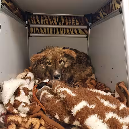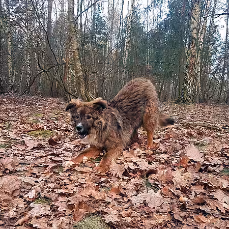 aktion tier- Mitarbeiterin Myriam erkannte vor Ort schnell, dass hier Ruhe und Geduld gefragt war. Die Hündin hatte keinerlei Vertrauen in die Menschen. Verständlich, denn insgesamt befand sich Nuri in keinem guten Zustand. Viel zu dünn und mit verfilztem Fell schienen es „ihre“ Menschen nicht gut mit ihr gemeint zu haben. Niemand weiß, wie Nuri in den Wald kam. Fakt ist aber, dass sich die Hündin trotz der ganzen Menschen, die sie zu fangen versucht hatten, trotz des Trubels und der Unruhe und entgegen ihres Fluchtinstinktes, nicht vom Ort wegbewegt hatte. Zudem lag nahe der Straße ein offener Sack Trockenfutter. Daher vermuten wir, dass jemand Nuri an der Straße ausgesetzt und ihr das Futter dagelassen hatte. Nuri hoffte nun vielleicht, dass „ihre“ Menschen zurückkommen… und wich deswegen nicht vom Fleck.