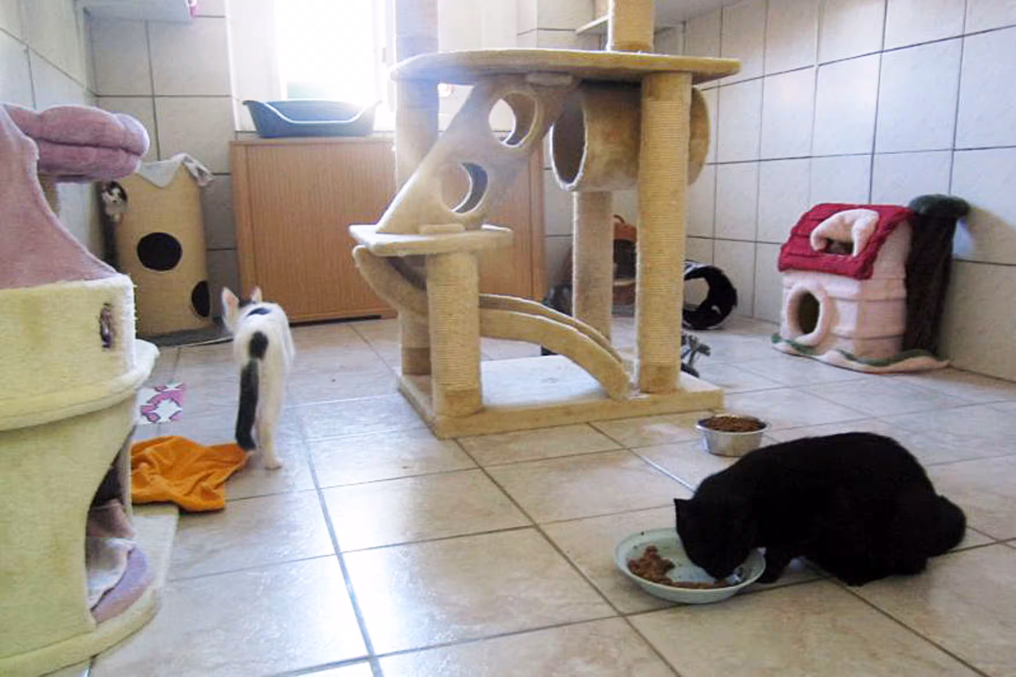 Die Katzen werden im Katzenhaus untergebracht. Die Katzenzimmer sind mit zahlreichen Kratzbäumen, Liege- und Klettermöglichkeiten, Decken und Spielzeug ausgestattet. Die an die Zimmer angeschlossenen Katzenausläufe bieten den Katzen die Möglichkeit, nach draußen zu gehen.